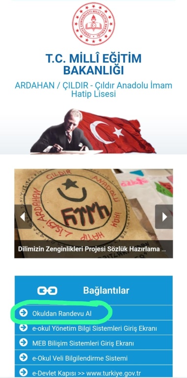 Sisteme giriş yapabilmek için e-devlet şifrenizle Okul WEB sitemzdeki "Okuldan Randevu Al" bağlantısını kullanmanız gerekmektedir. Görseli ve bağlantı adresi aşağıdadır.